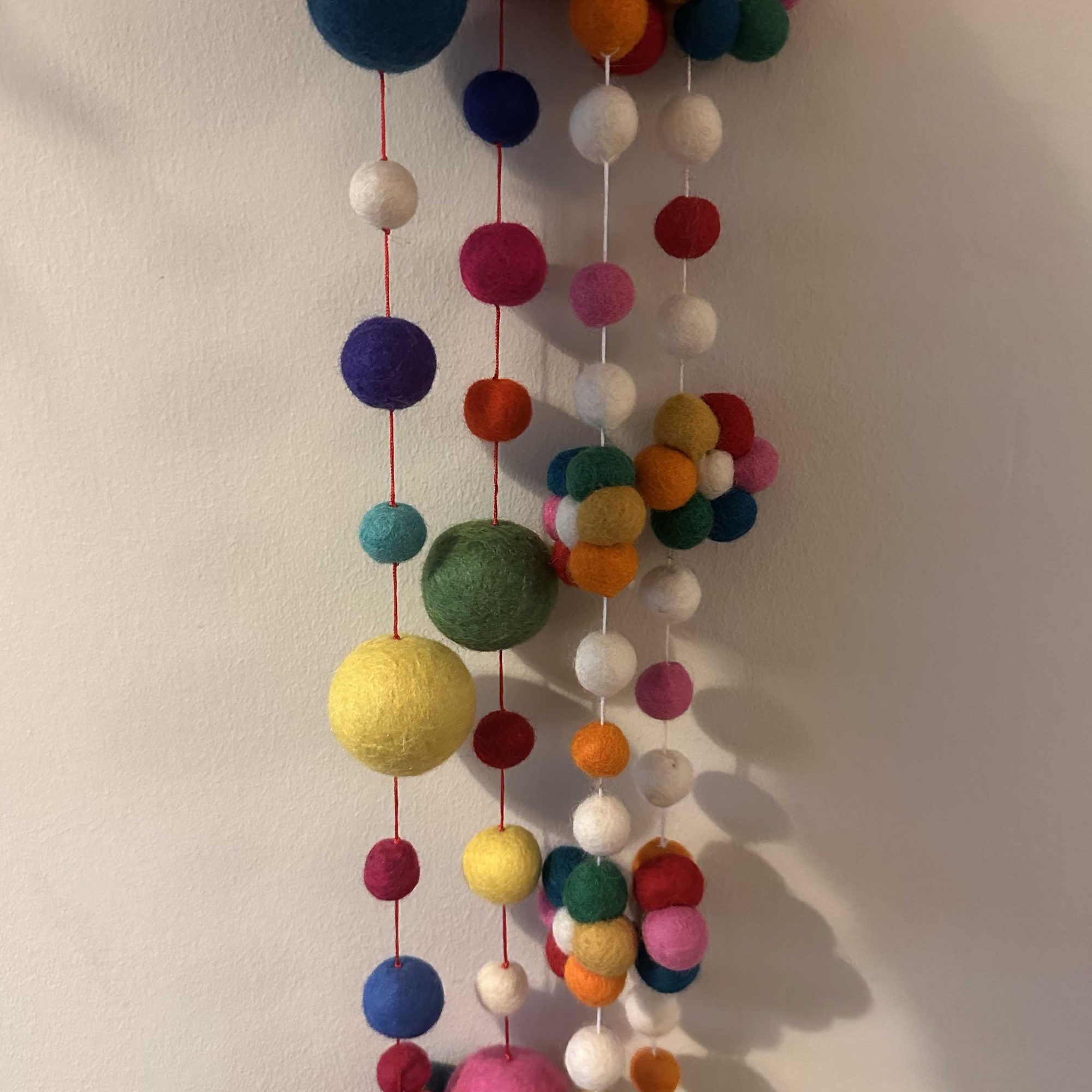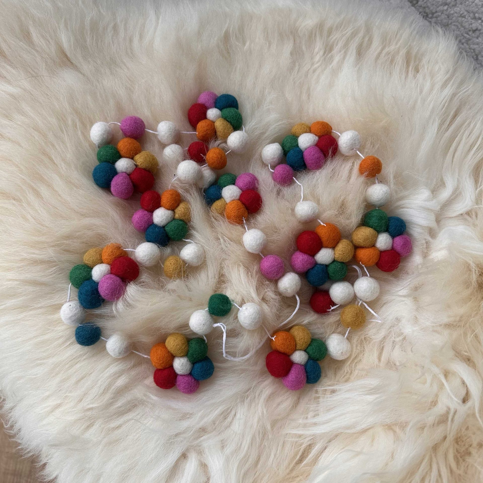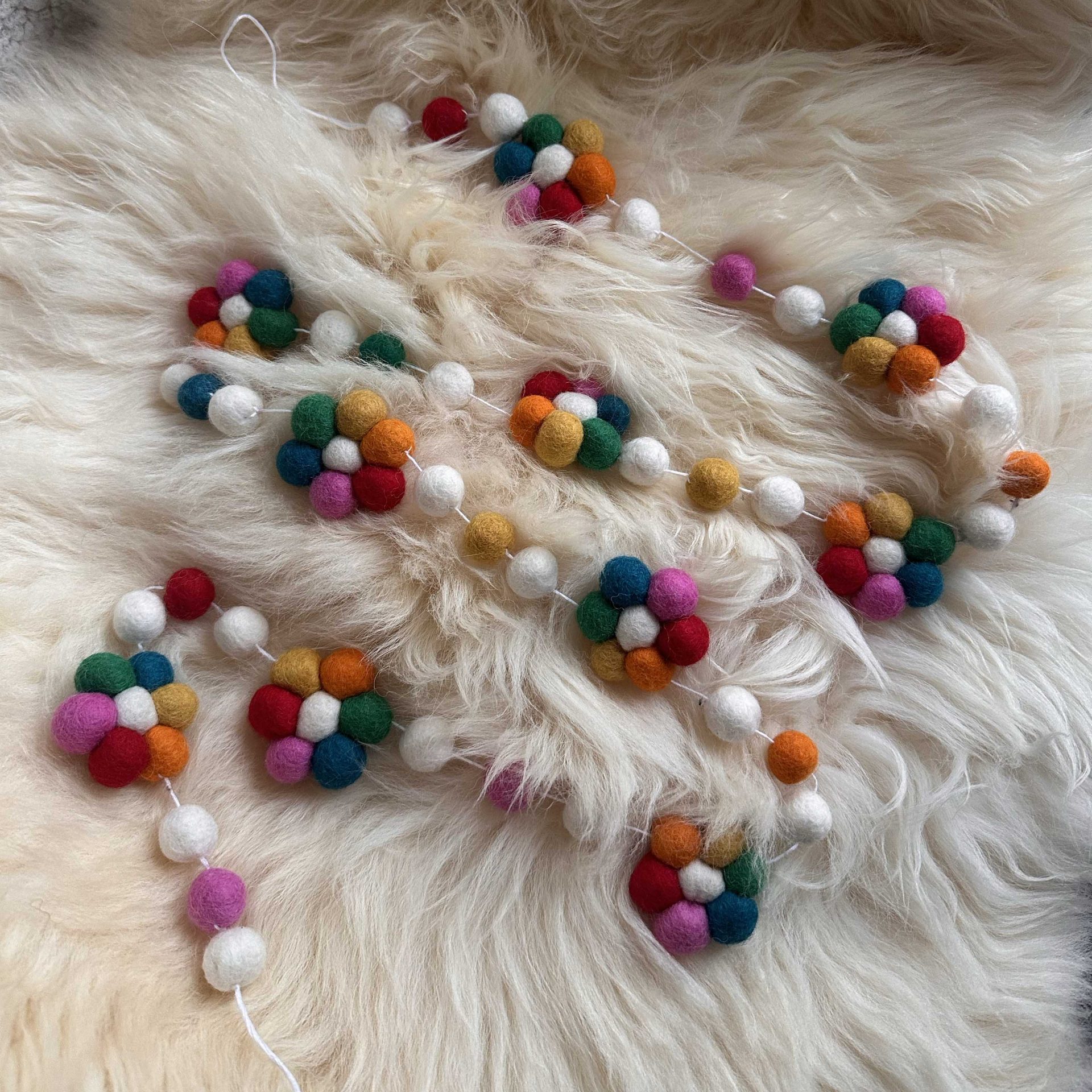 The felted wool is crafted into a multi-colour display of around 10 flowers each divided by 3 felt balls and attached by a white thread with handy hanging loops on both ends.