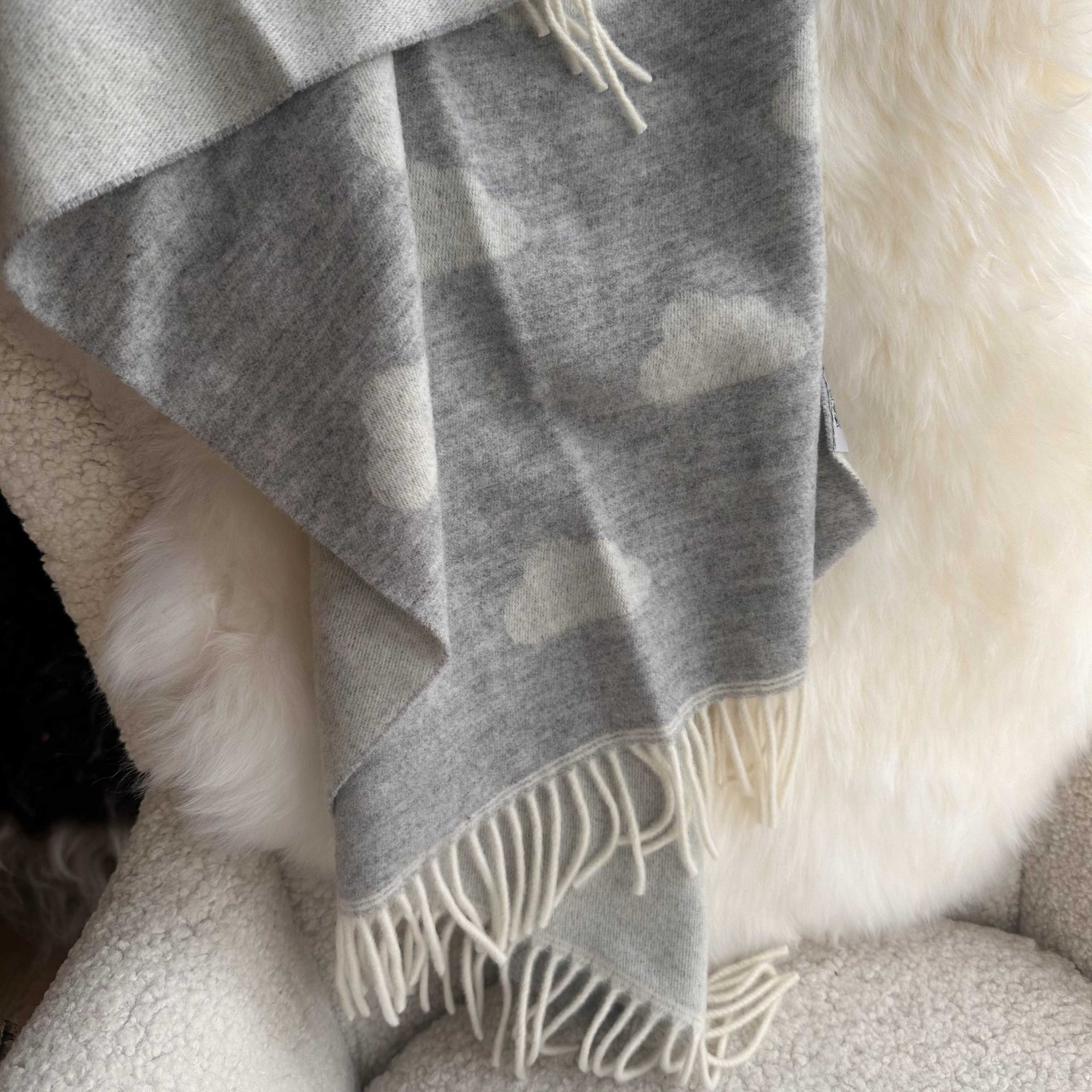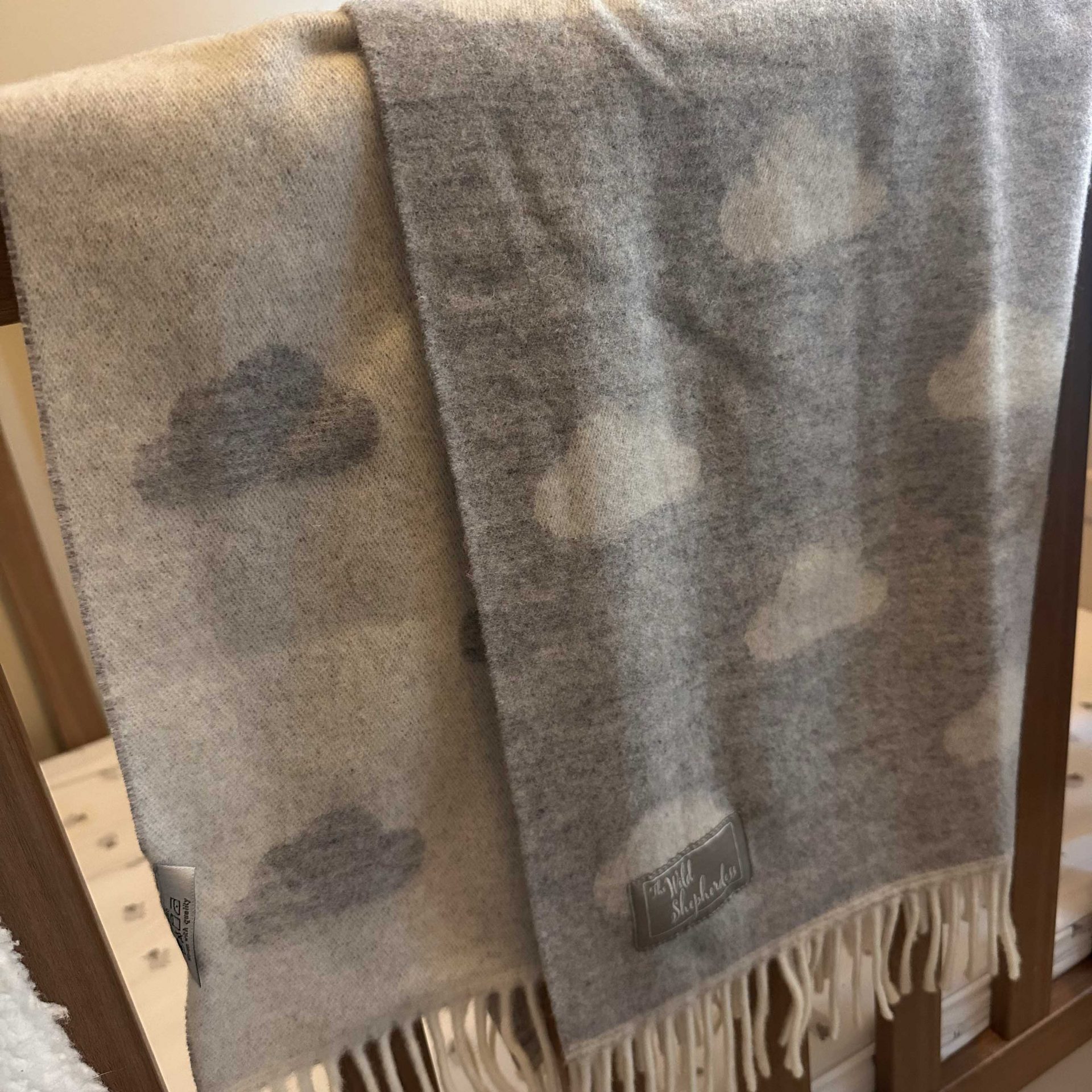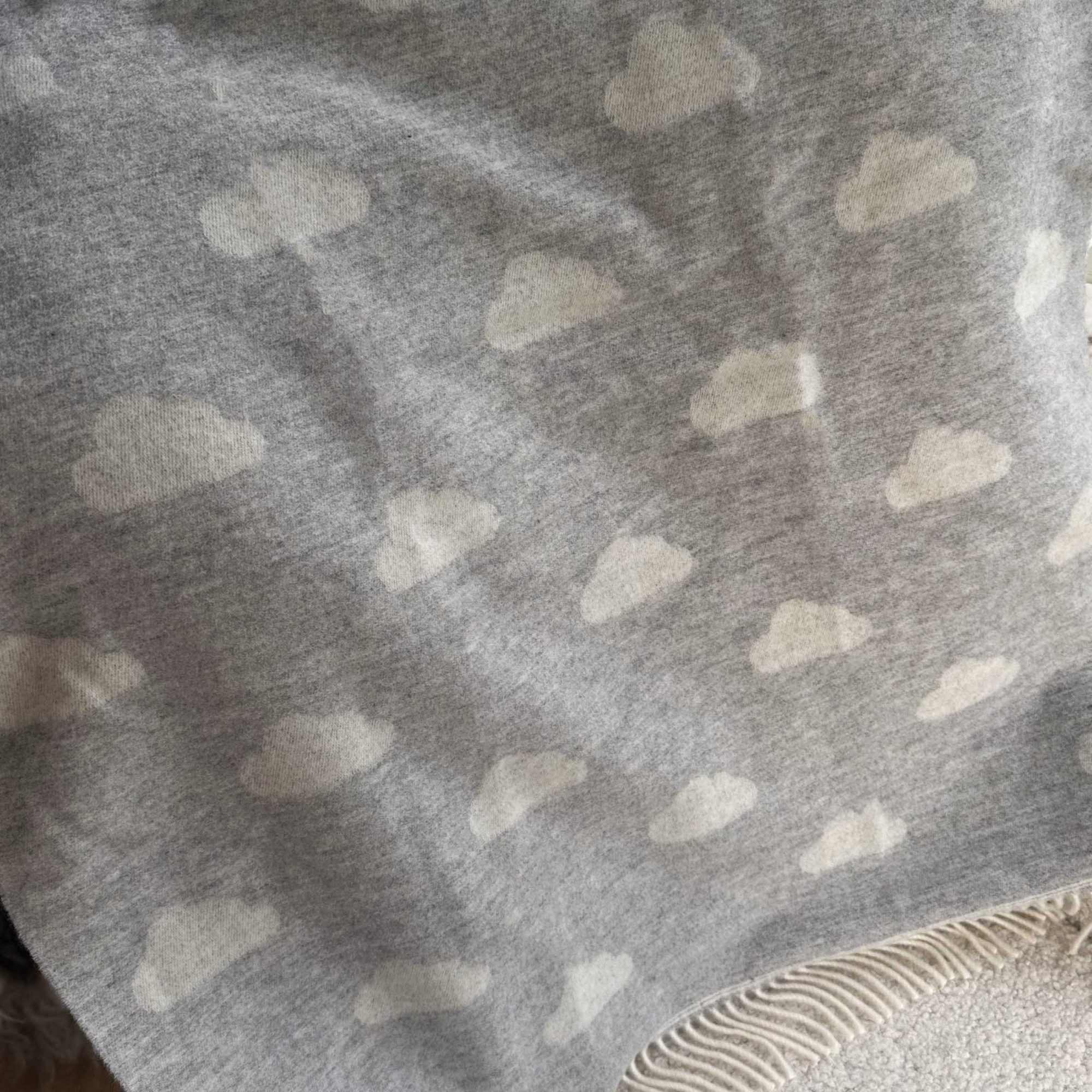 The intricate weave uses a soft grey and cream yarn to create a beautiful cloud design, finished with soft fringe tassles. The perfect nursery accessory for those luxe aesthetics.