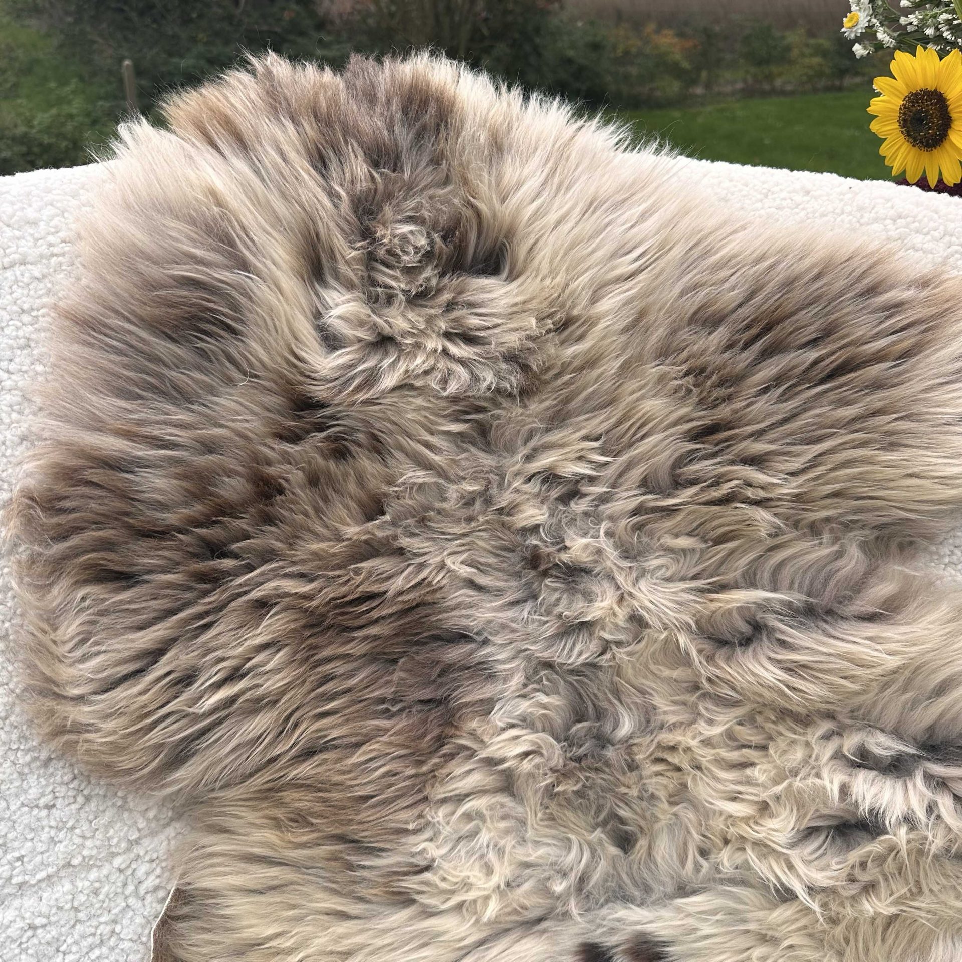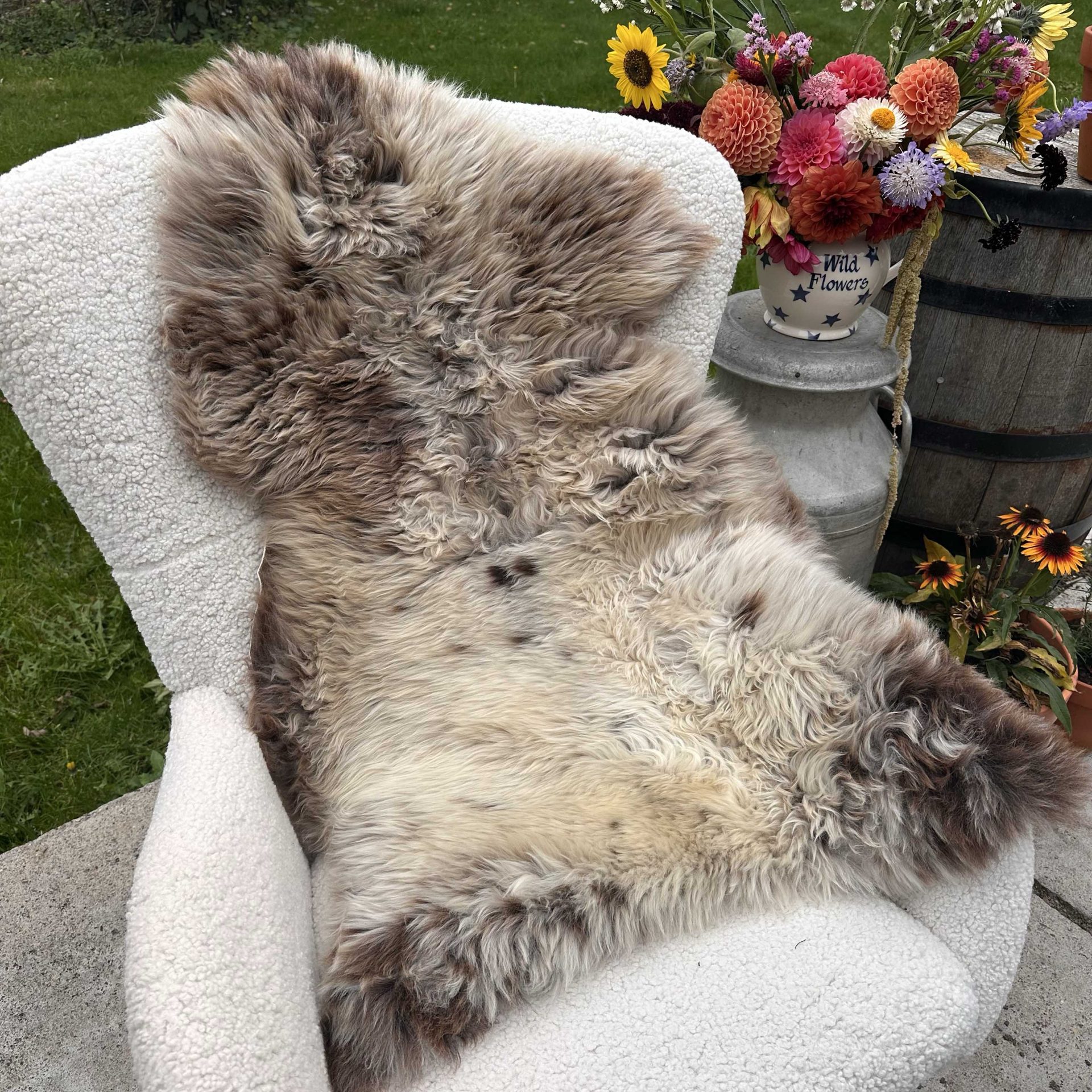 How stunning is this sheepskin!? With truly unique markings, this crossbreed is silky smooth with a versatile cappuccino vibe in colouring. A luxury one of a kind British Sheepskin.