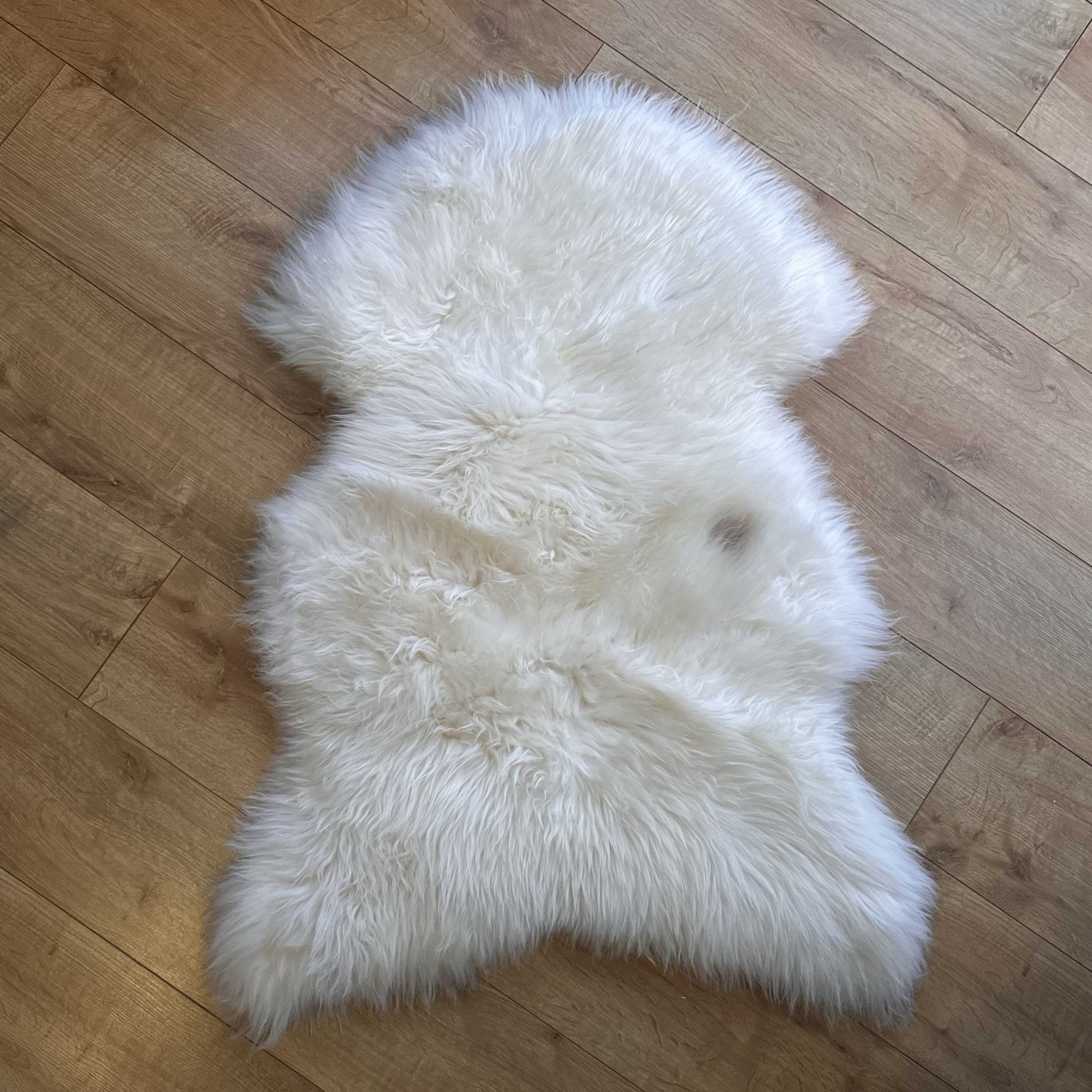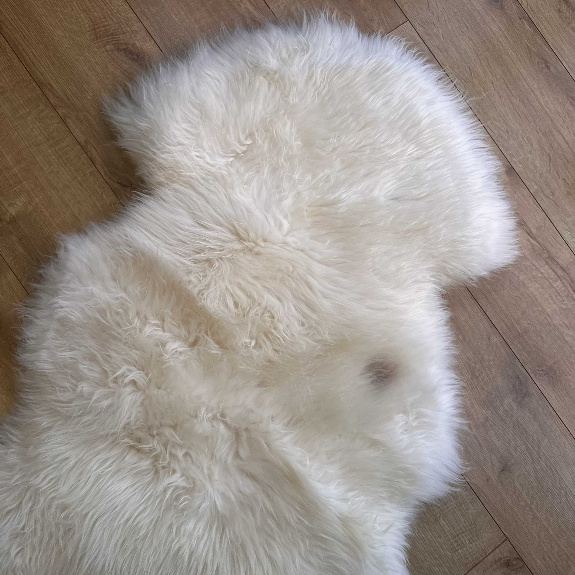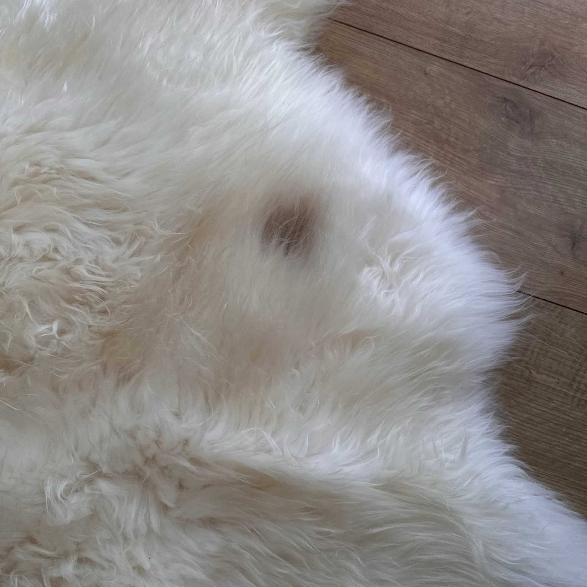 Beautiful, silky soft sheepskin with a. fluffy fleece. The sheepskin features one quirky brown spot.