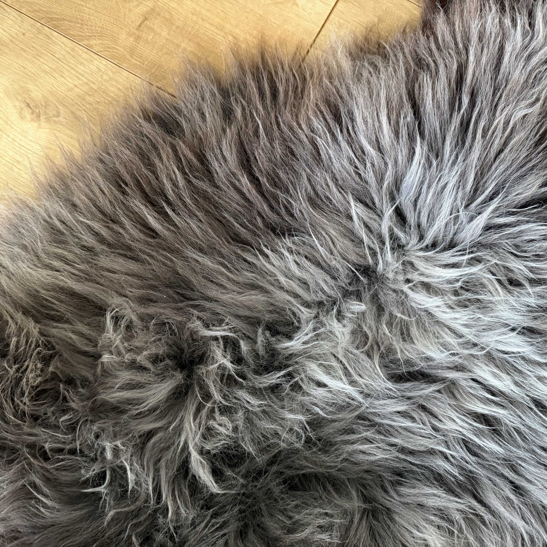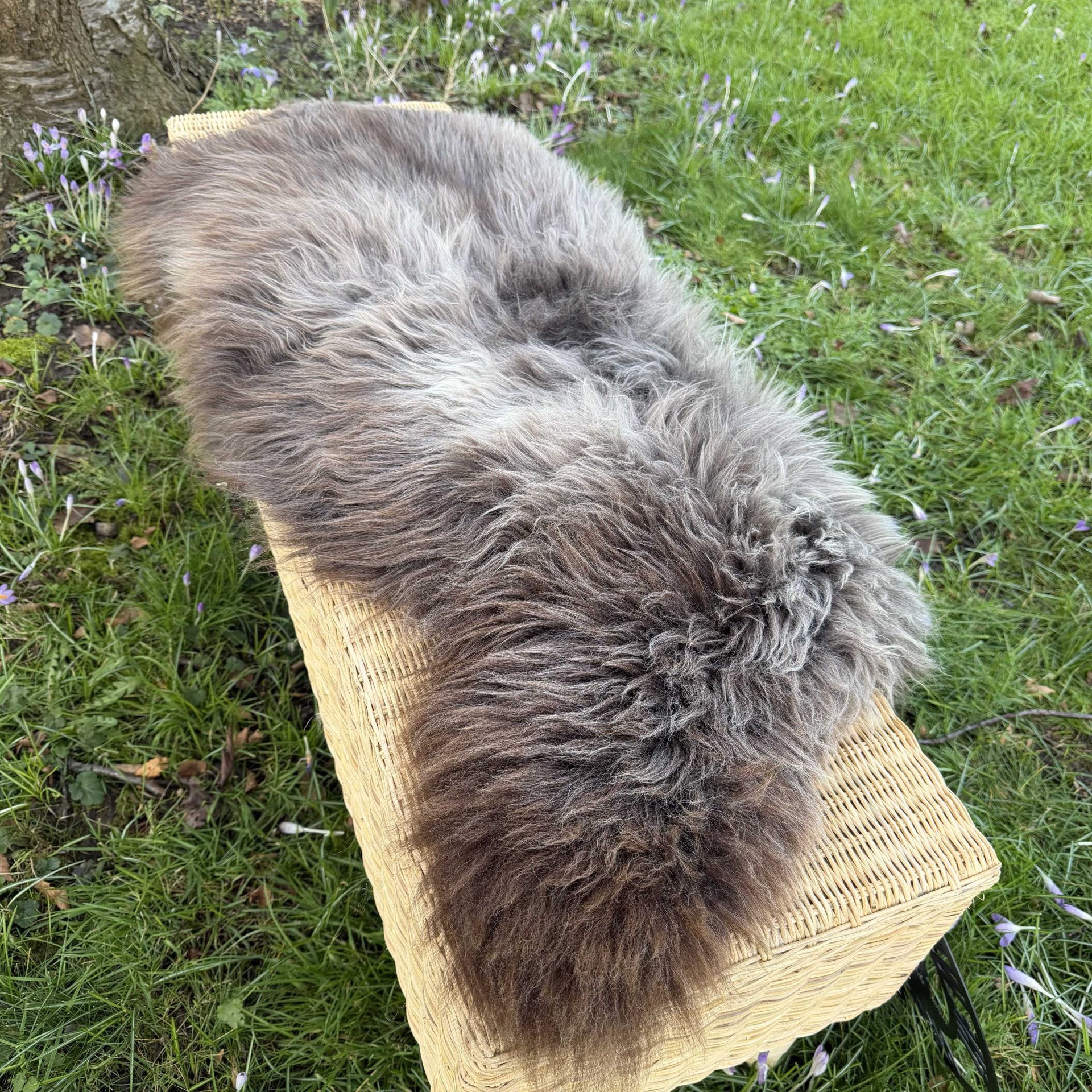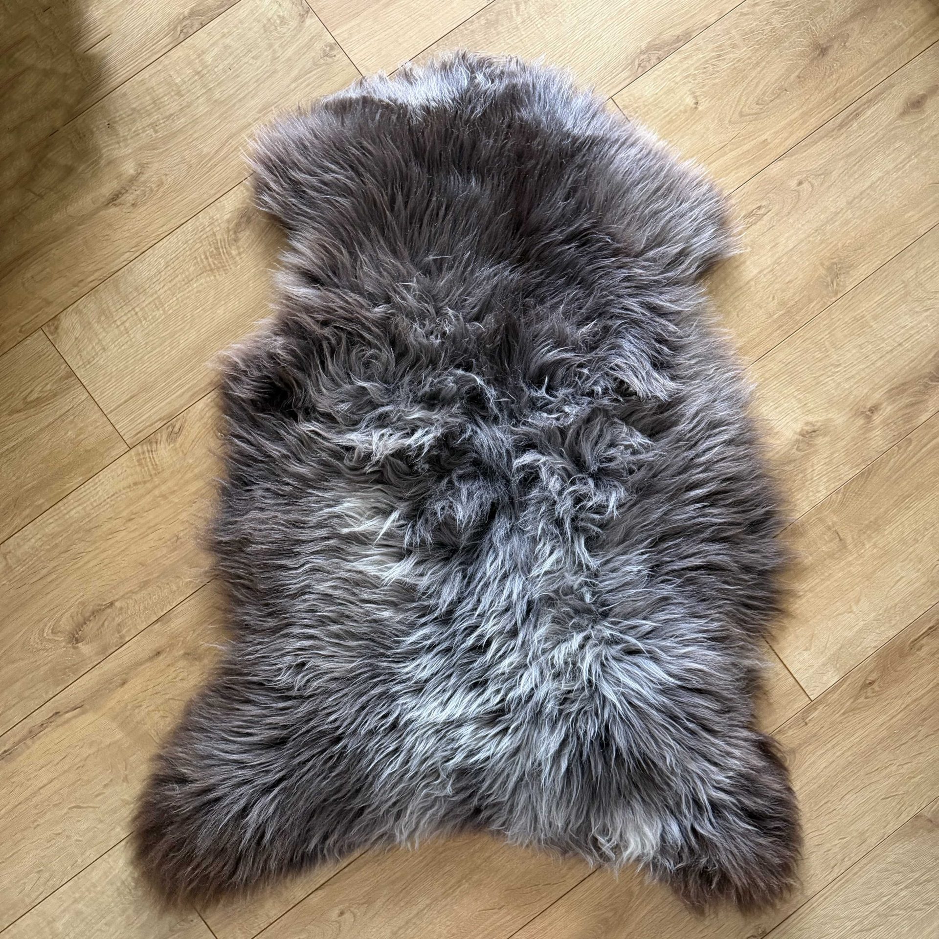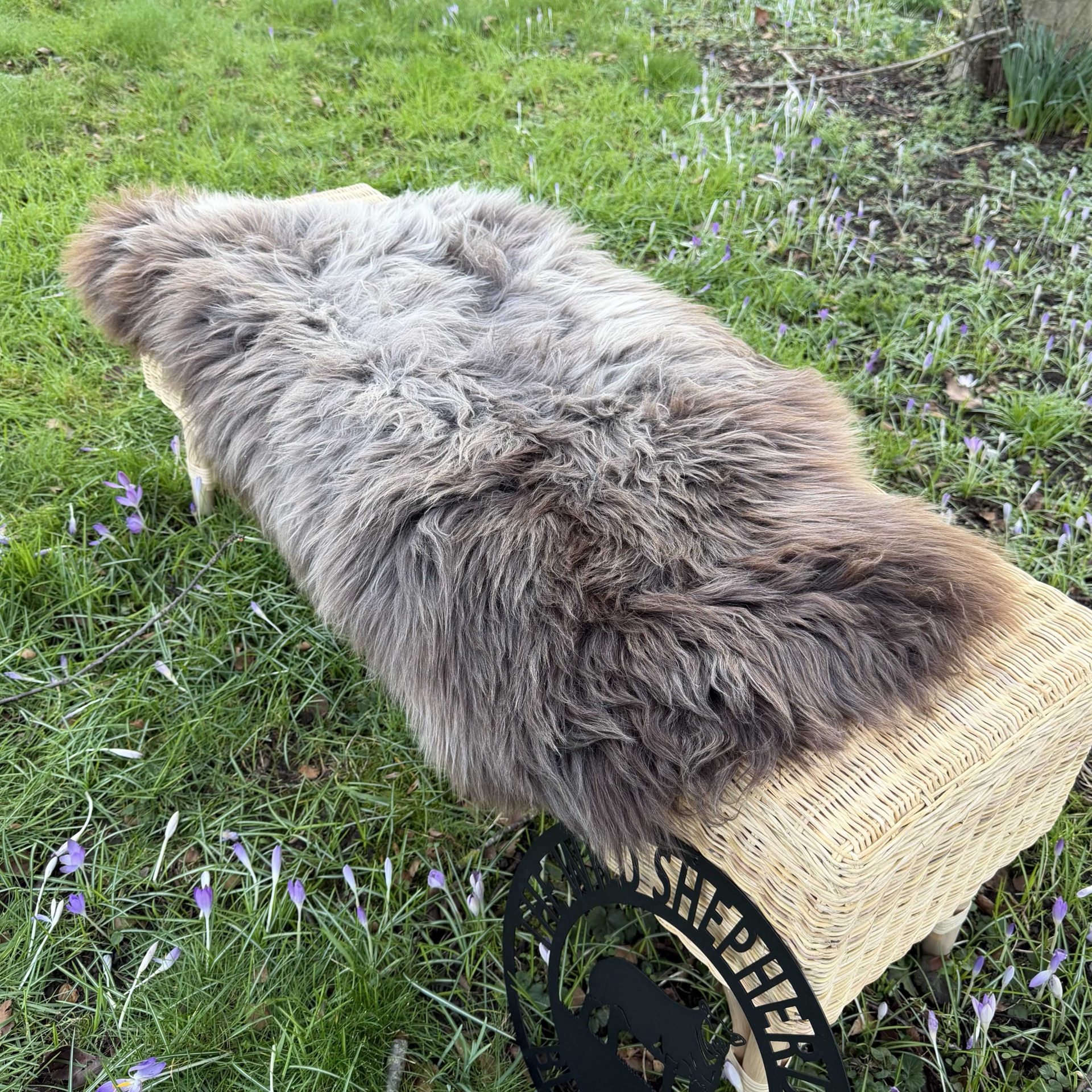 Featuring beautiful long, thick fluffy locks. This sheepskin is rich in texture and features brown and grey tones.