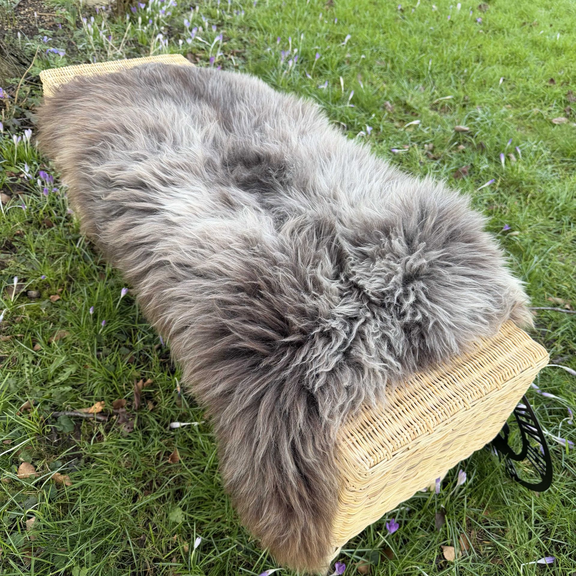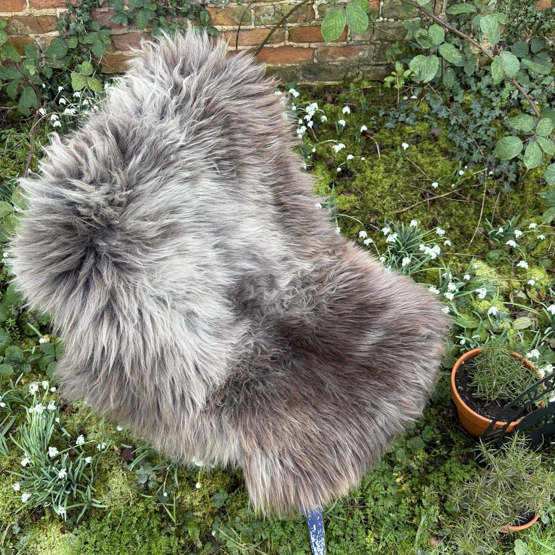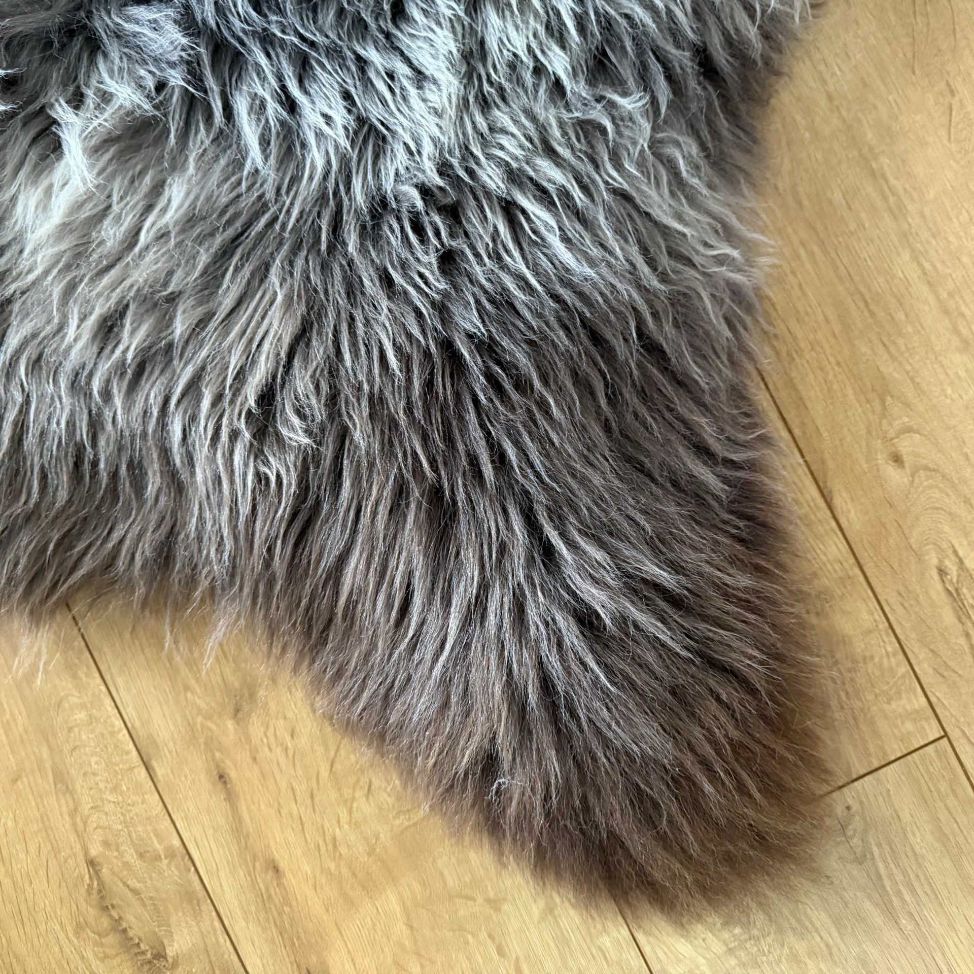 Featuring beautiful long, thick fluffy locks. This sheepskin is rich in texture and features brown and grey tones.