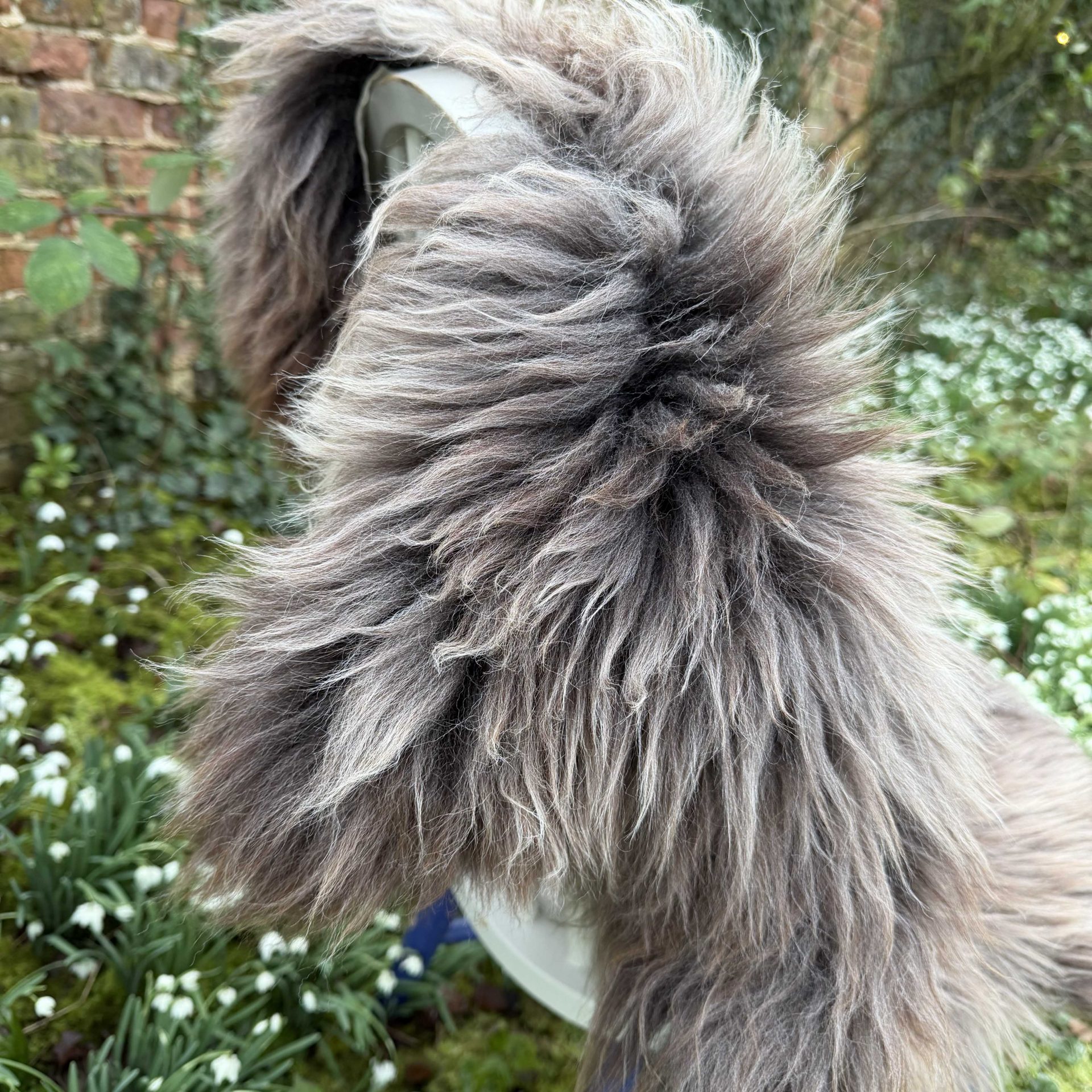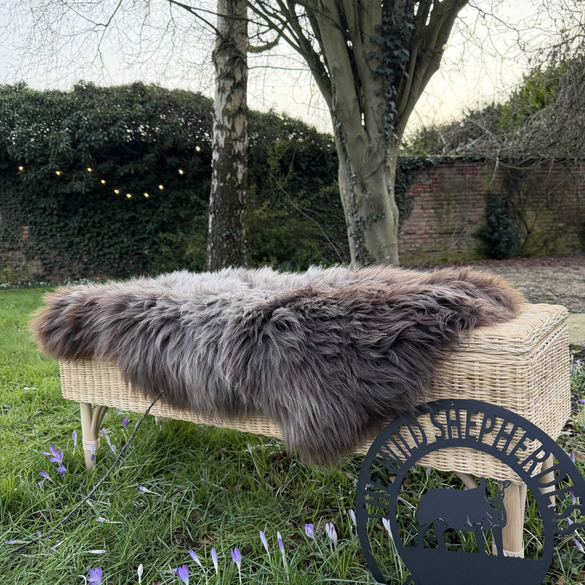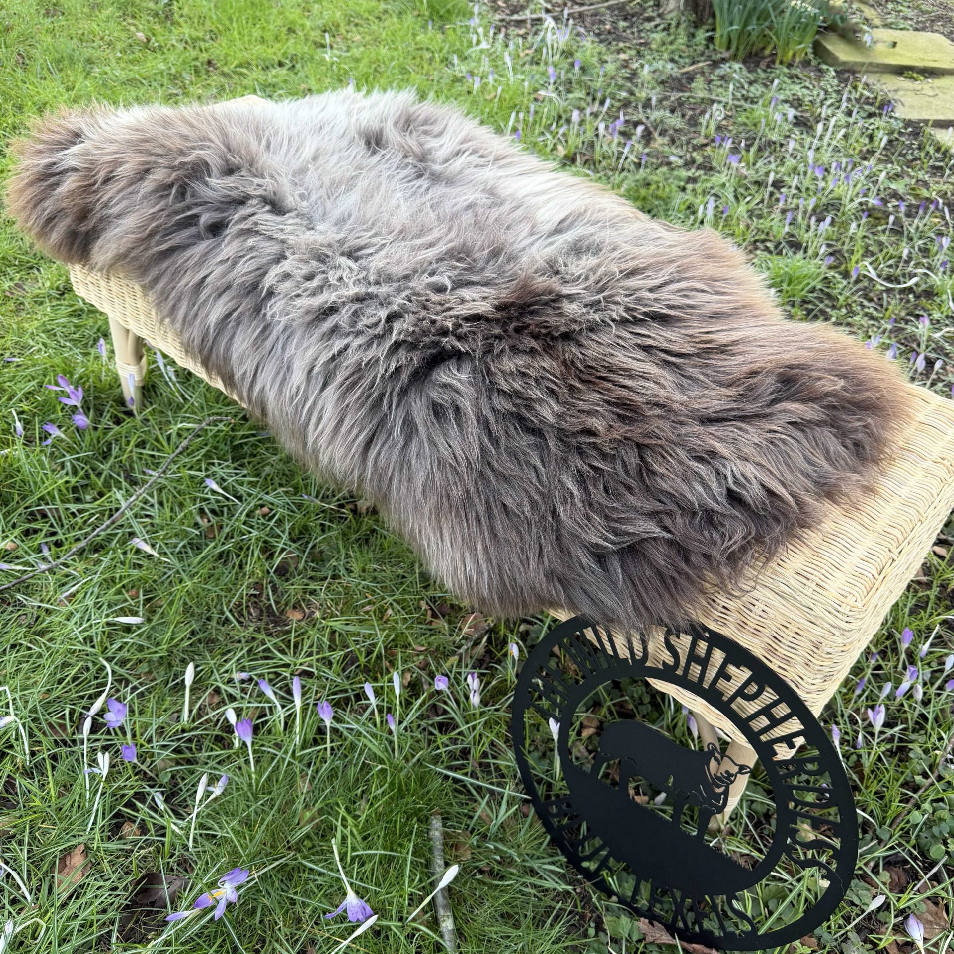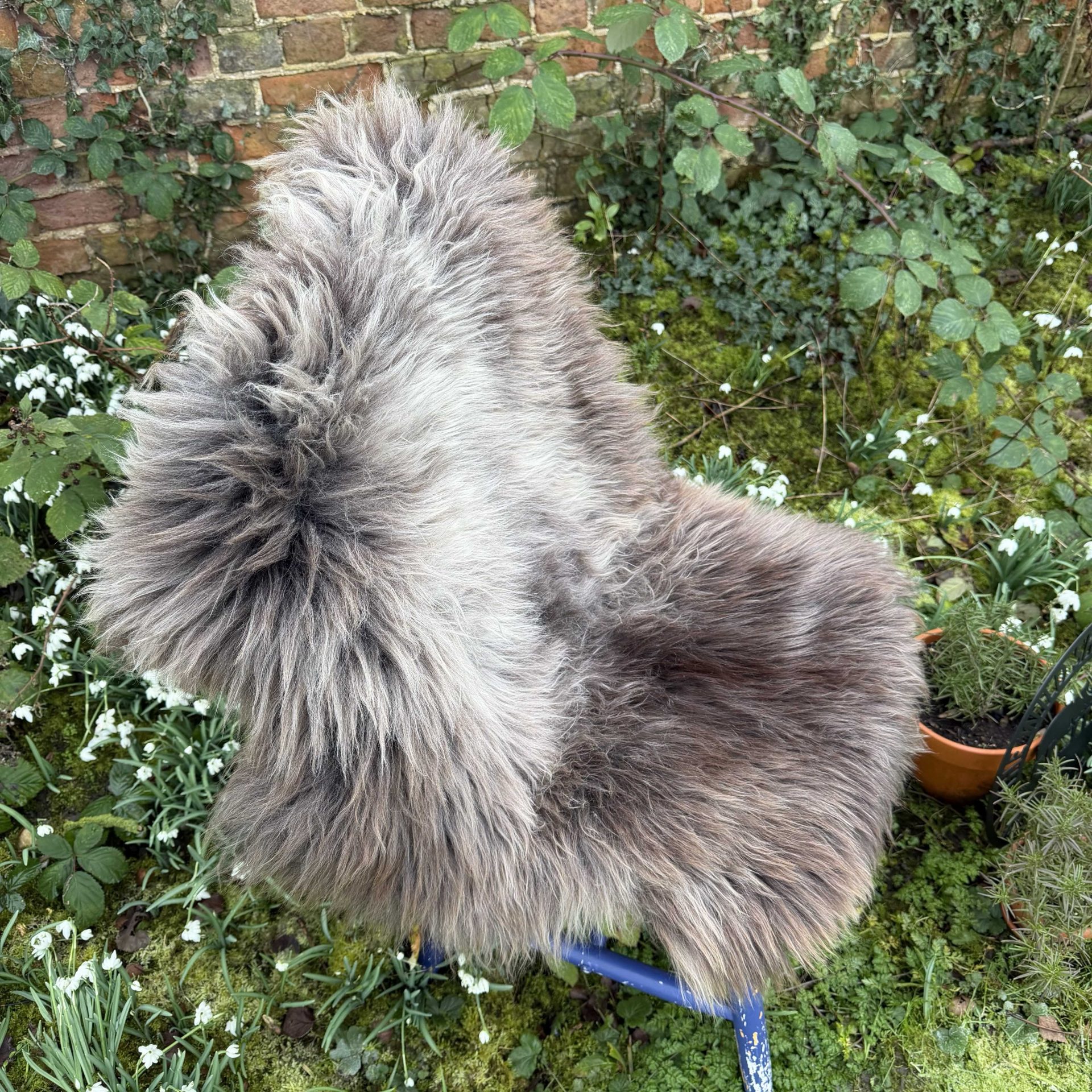 Featuring beautiful long, thick fluffy locks. This sheepskin is rich in texture and features brown and grey tones.