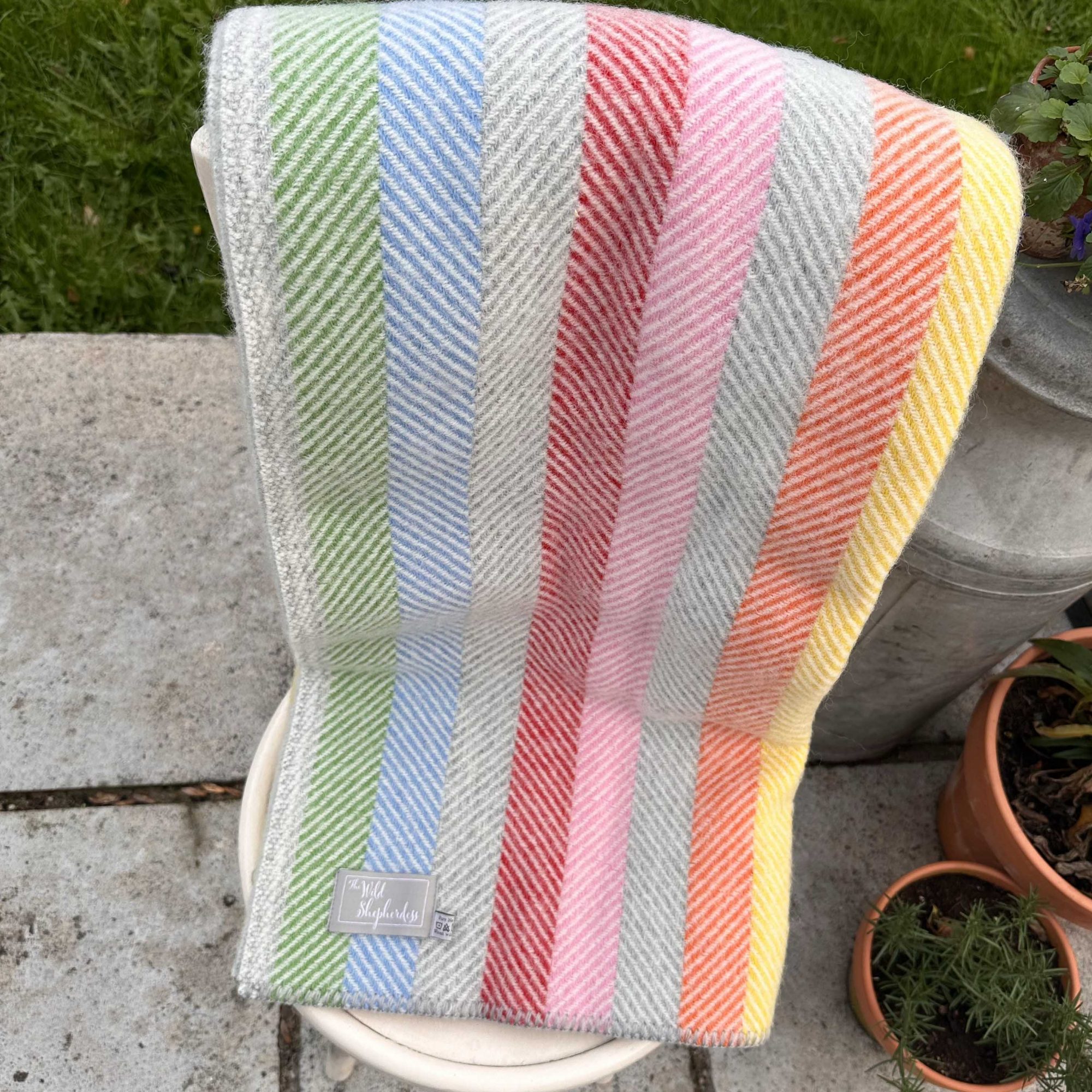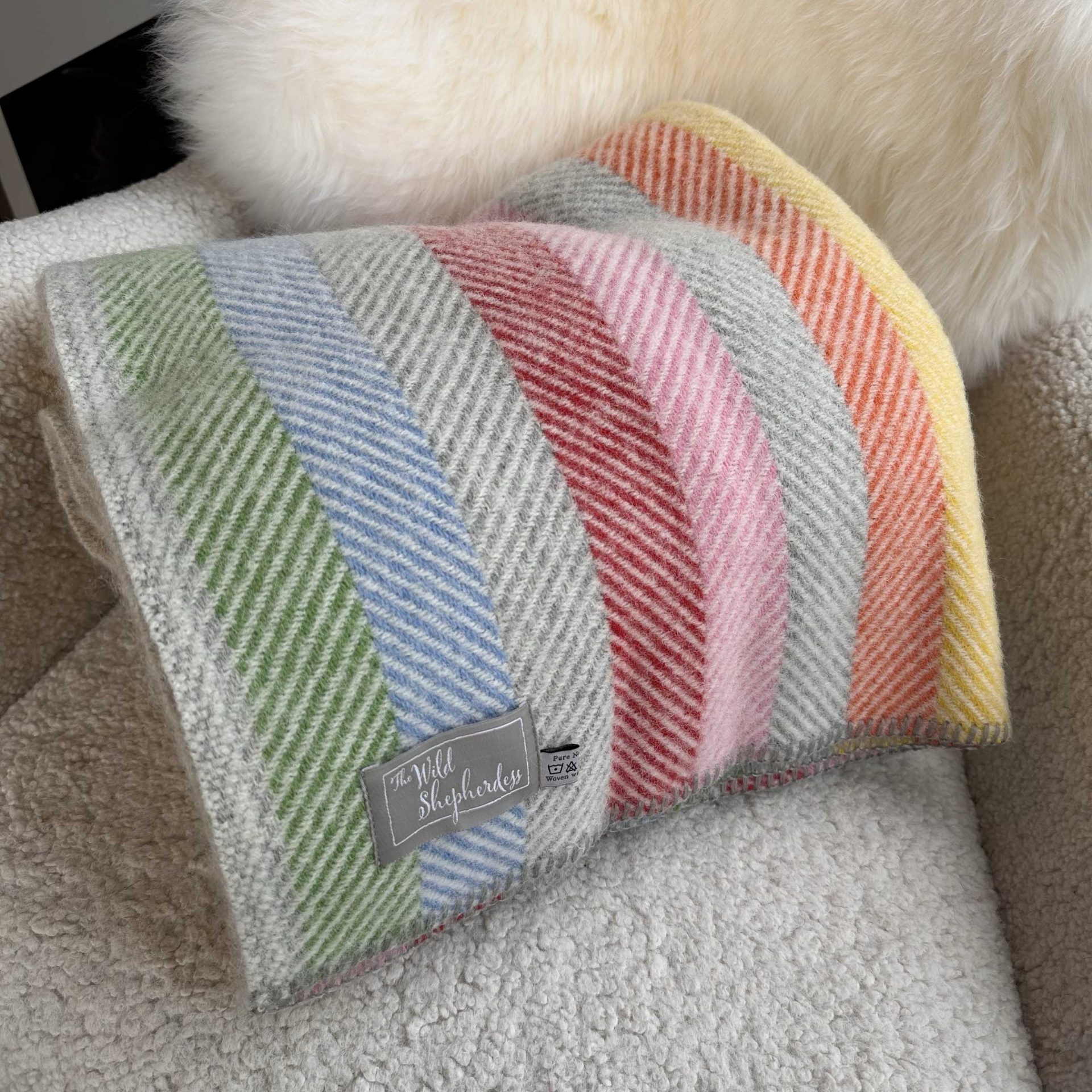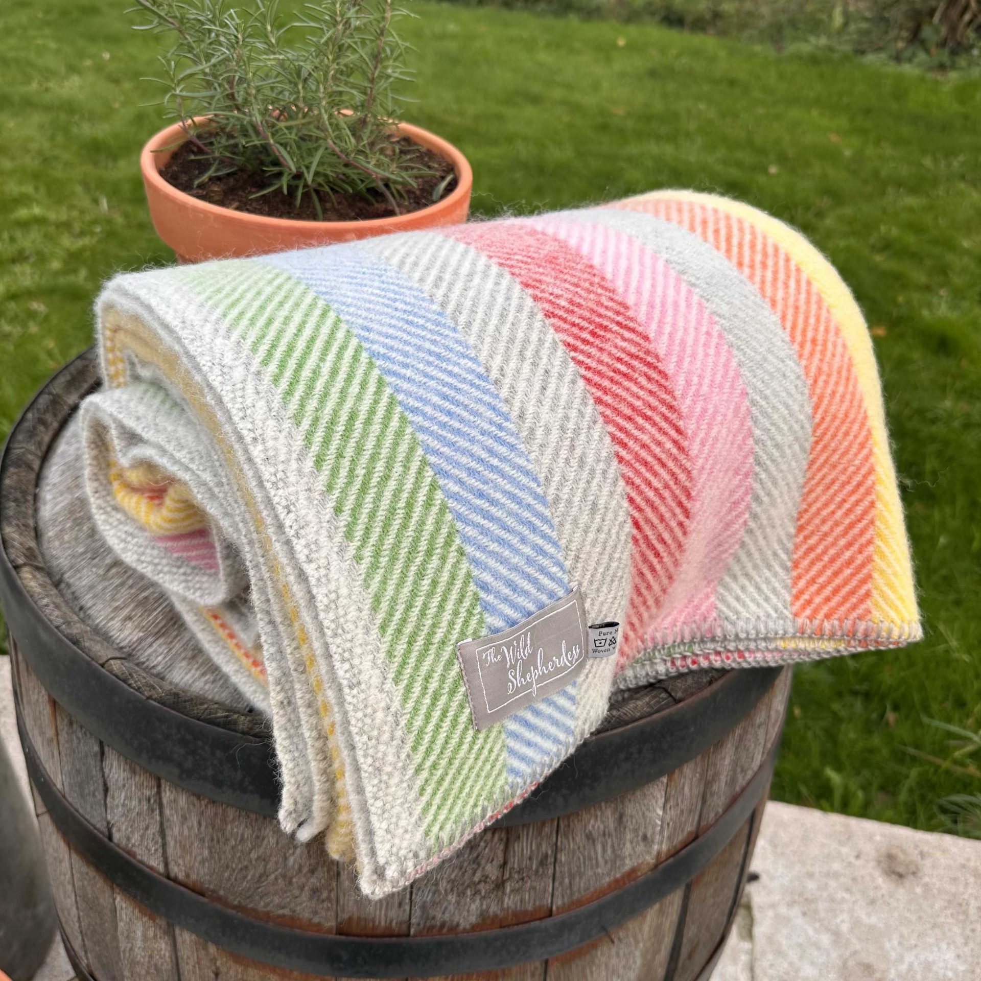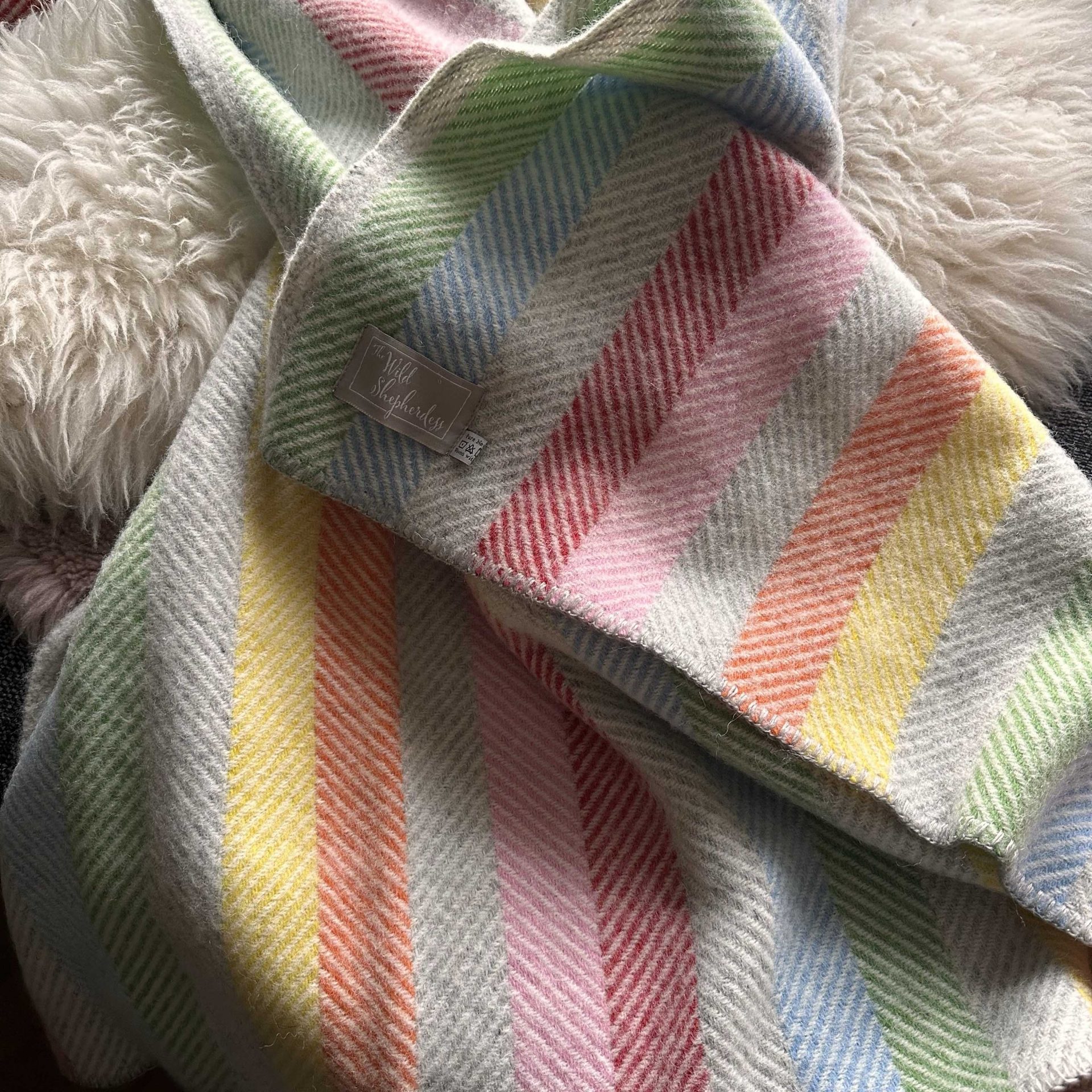 This extra large blanket features a timeless fishbone weave with a rainbow inspired colourful toned stripe to create a contrasting pattern with lots of texture. Finished with Blanket Stitch edging.