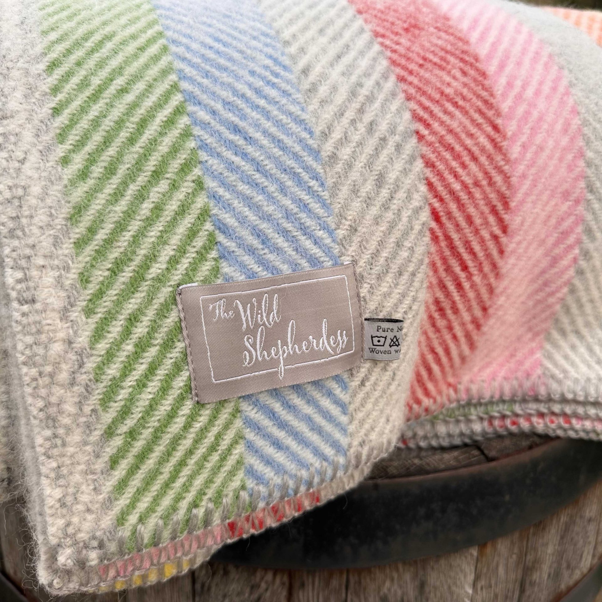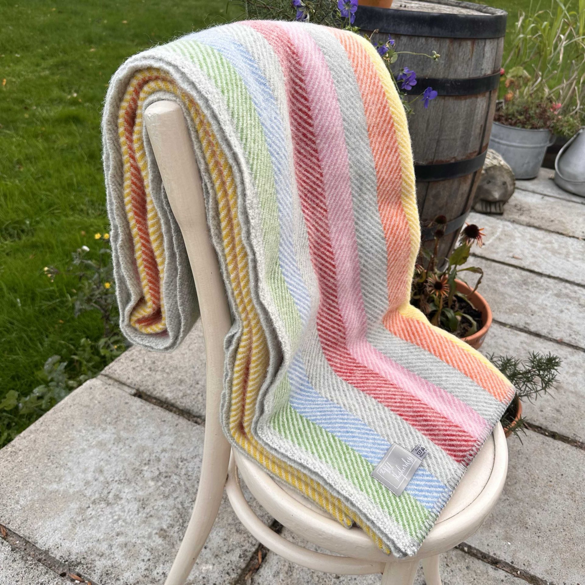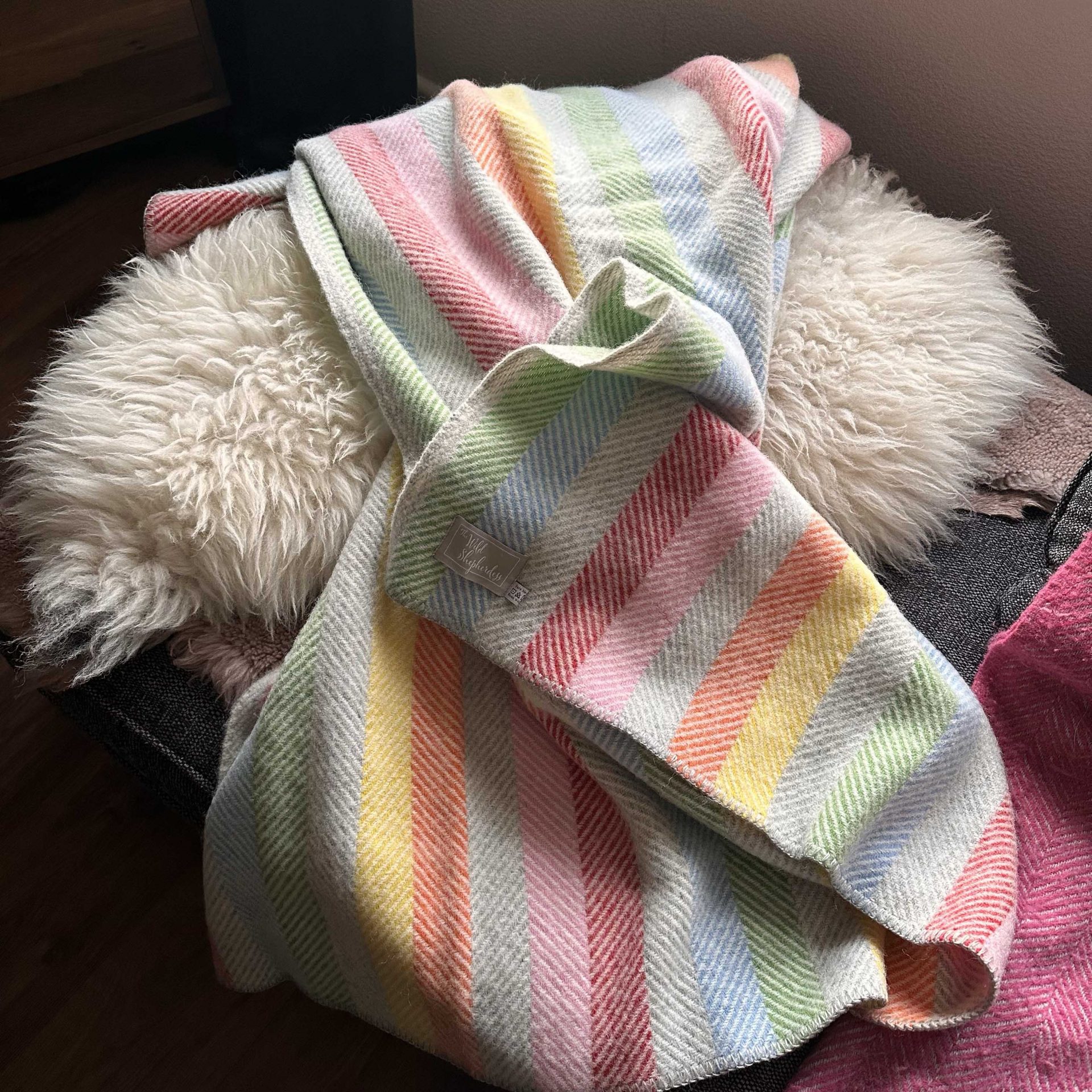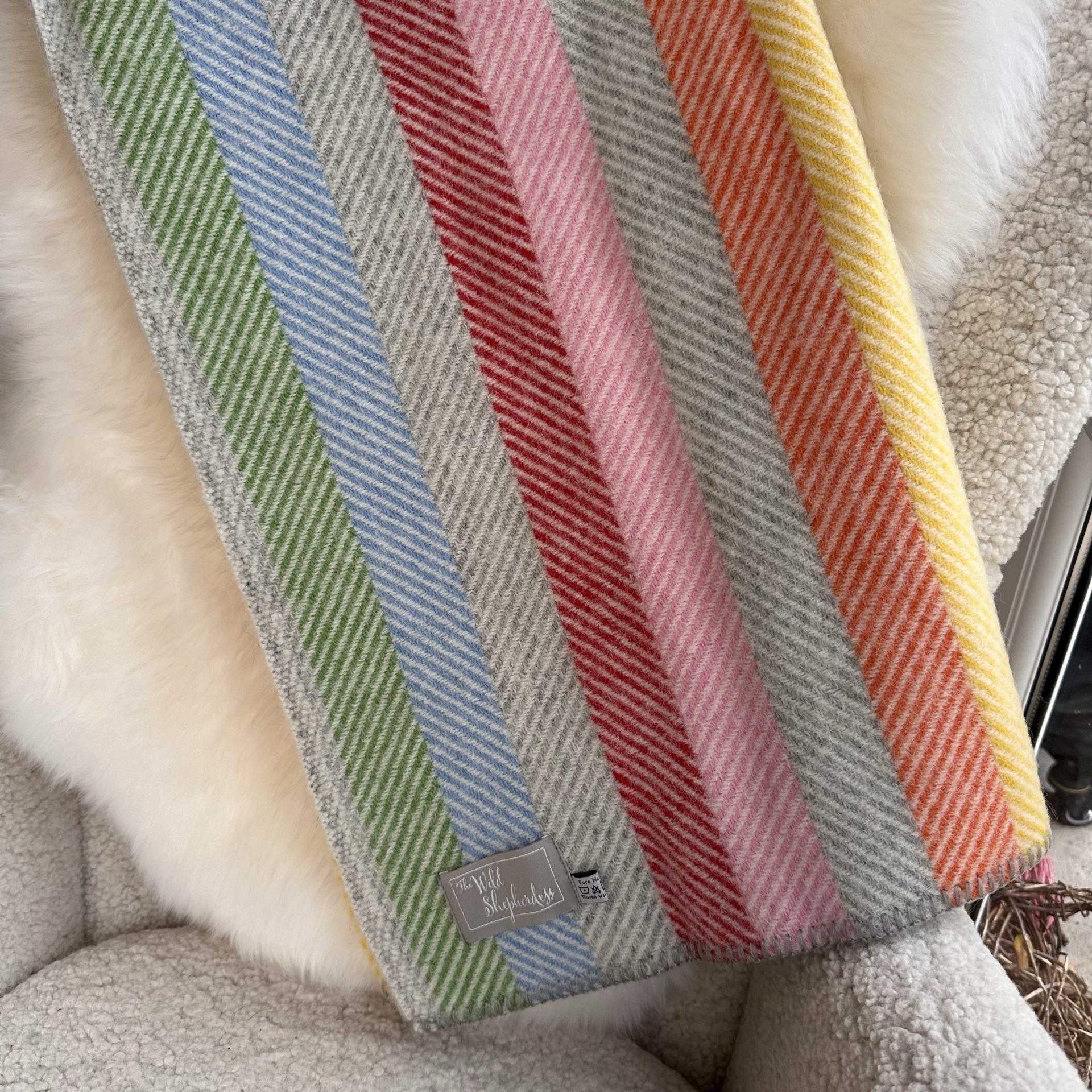This extra large blanket features a timeless fishbone weave with a rainbow inspired colourful toned stripe to create a contrasting pattern with lots of texture. Finished with Blanket Stitch edging.